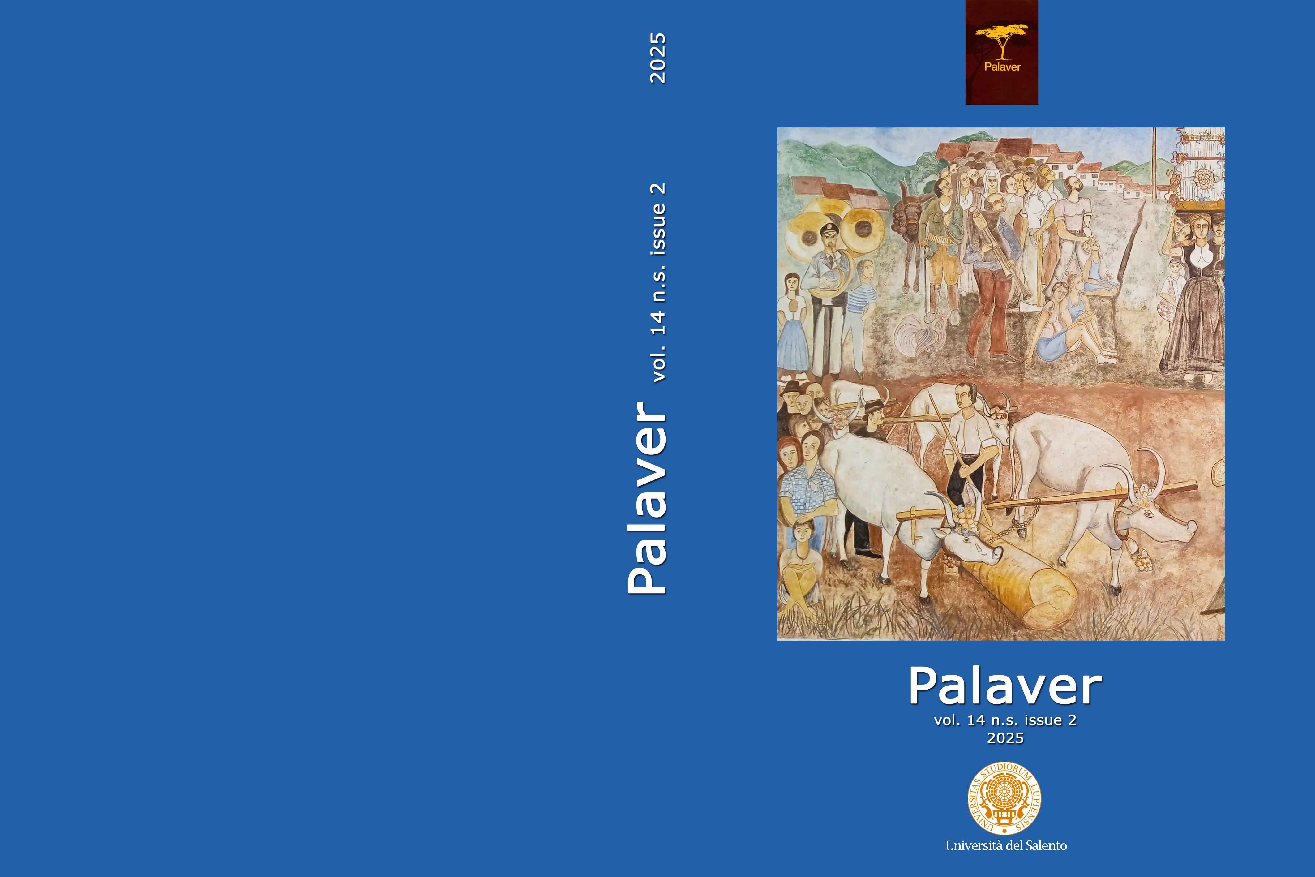 Palaver is a biannual scientific journal published on line by the University of Salento (Lecce, Italia: Coordinamento SIBA – Università del Salento); it has an international scientific committee, and an editorial staff composed of specialists in Cultural Anthropology, Linguistic and Literary Studies. Scientific contributions submitted for publication are peer reviewed, and assigned DOIs if published. Access to the journal is free. Palaver publishes scientific articles related to the various fields encompassed by Cultural Anthropology, Linguistics, Modern Foreign Languages, and covers issues concerned with cultural dynamics, intercultural relations, diasporas and related literary production, migration, and translation.